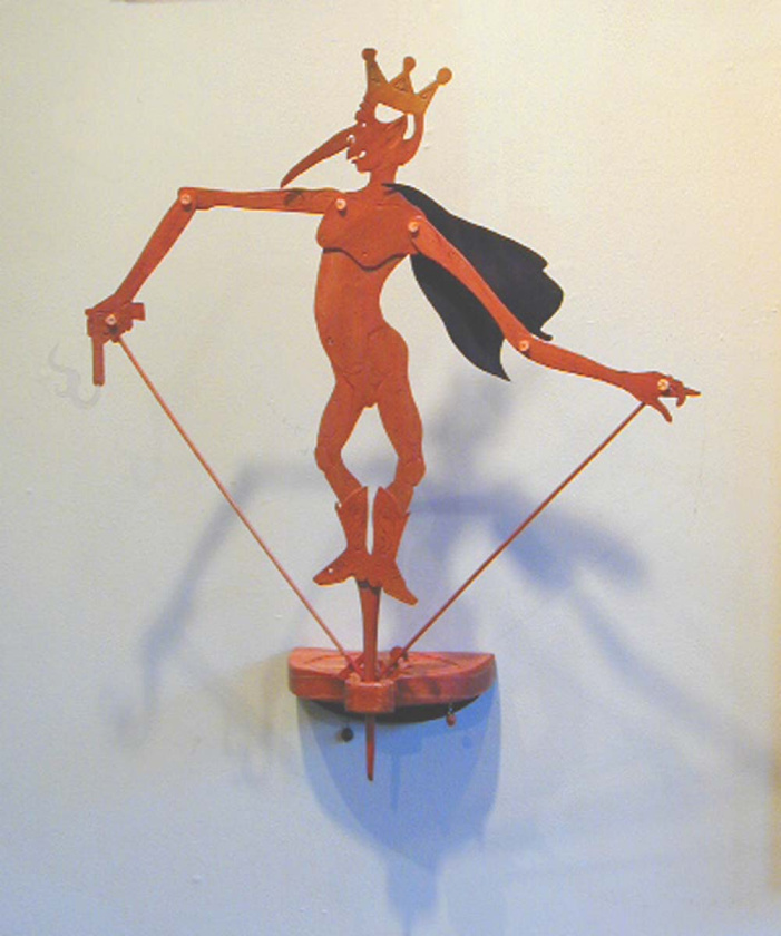I'm doing what I can before the election. What you can't see here is the carved shelf that holds the puppet; it's Dick Cheney with his hands around W's support stick. Technically, this work was challenging.