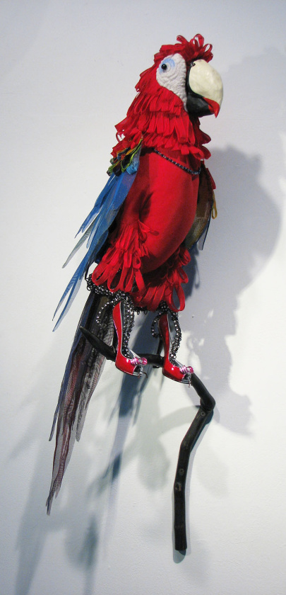 Madam was the second of my "She-Bird" series. Macaws are such flashy birds; I wanted to emphasize that. She has on lipstick, sports glittery jewelry, and teeters on ridiculously high heels.