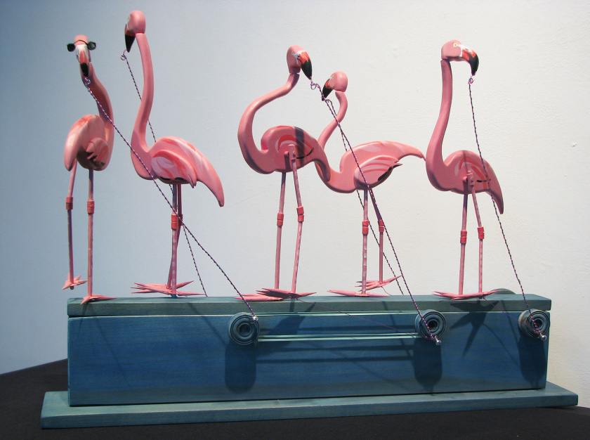 I saw a video of flamingos doing their mating dance and couldn't get it out of my mind. They walk along the shore jerking their heads from side to side. I relished the mechanical challenge of depicting this somehow. In the process, I tried way too many ideas that failed. I was torn between the folly of persisting and a determination to reach a solution. This is the result. I'm hoping to make a video of it.