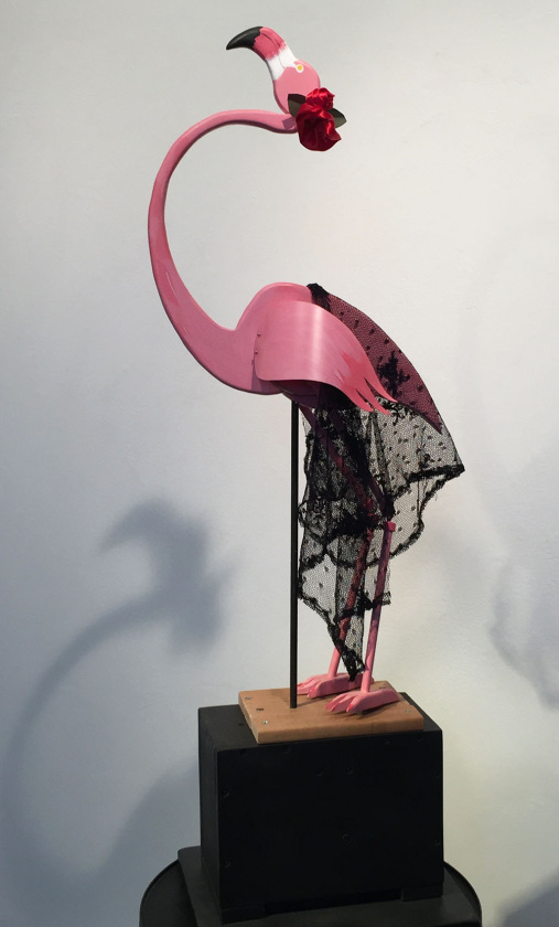 It is common for people to mispronounce "flamenco" as "flamingo". That fact is what inspired this piece. When you turn the crank (not visible here), she does a "zapateado." The sound comes from her feet and from a castanet inside the box. Getting the mechanisms to run smoothly required many re-do's and adjustments. She originally wore a red satin, flouncy skirt, but it overwhelmed the sculpture.